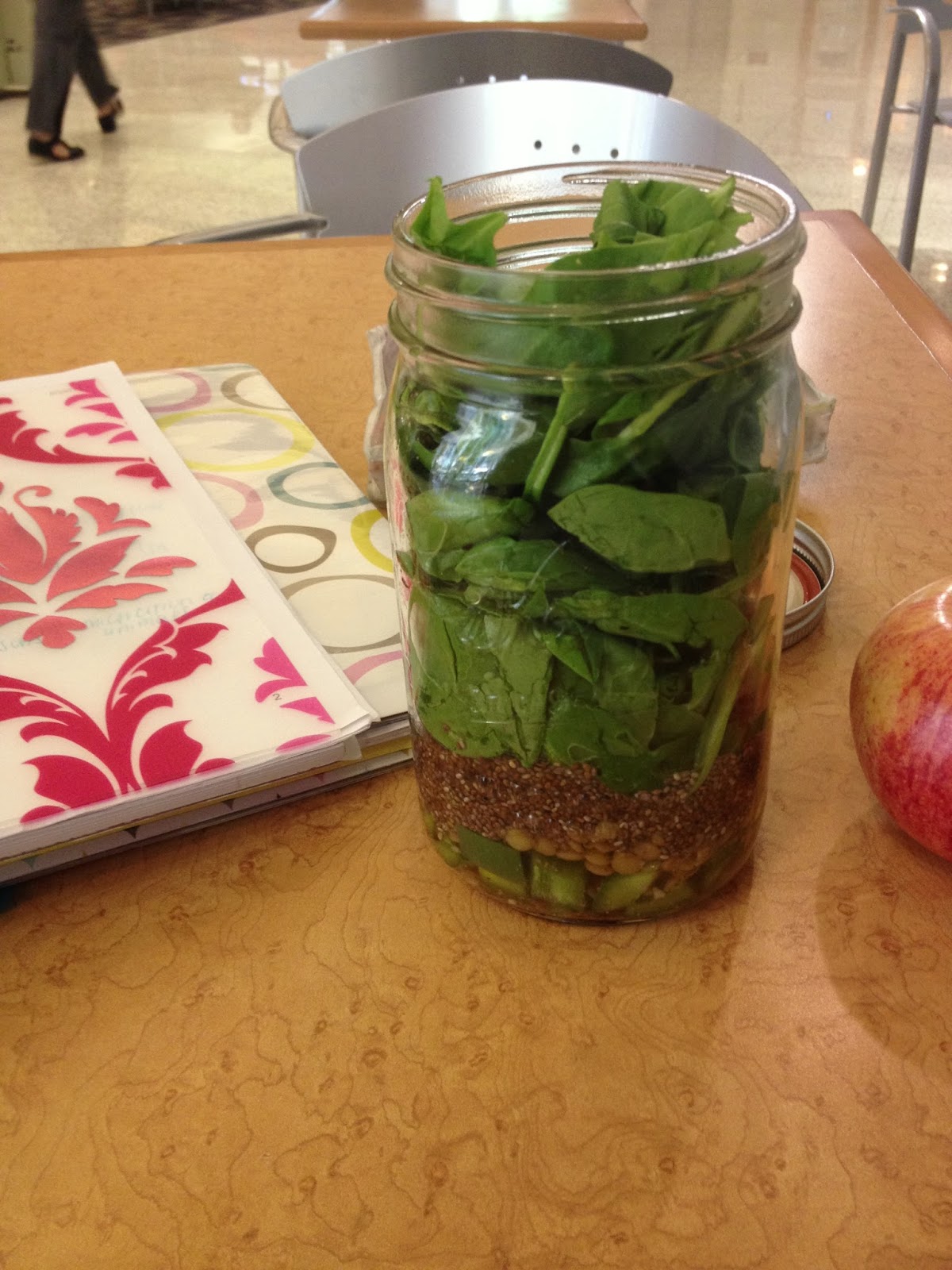 | When I have my longer day on campus, I bring a mason jar salad piled with goodies. This salad had moroccan lentils, chia seeds, peppers, homemade vinaigrette and spinach. An apple was the sweetness and I had a baby apple juice with it. It takes two minutes to make but it tastes AMAZING. |